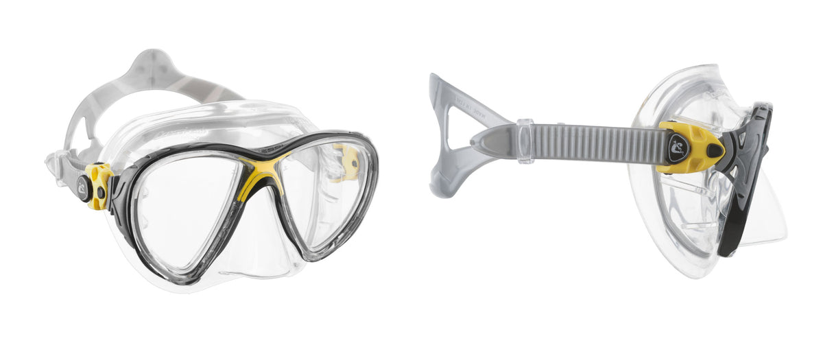 The ultimate in comfort and performance, the Big Eyes Evolution Crystal combines the best of Cressi technologies. Raked lenses, with Cressi’s inverted tear-drop shape, are placed close to the eyes for an exceptional field of view, and the Crystal Silicone skirt delivers excellent light transmission while resisting discoloration and fogging.