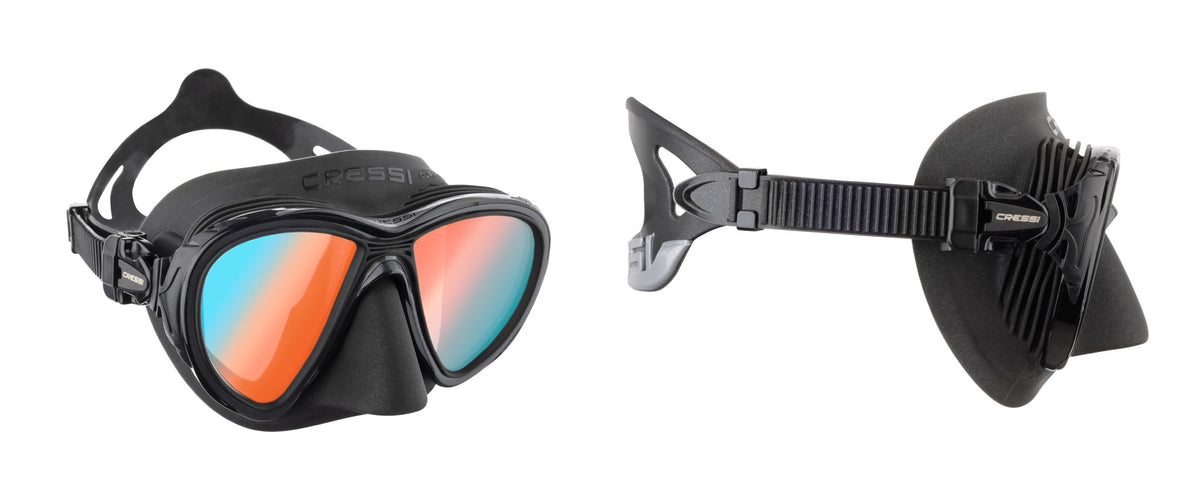The major innovation with the Quantum mask is that as well as offering enhanced downwards vision it avoids the fogging phenomenon through the internal thermoregulation of the warm, damp air exiting the nose. This air is channeled by a system of membranes set in the molding around the eyes and nose and deviating the flow towards the rubber skirt rather than the lenses. The external part of the skirt features a cooling system composed of two small heat exchangers that act as radiators. The effect is that the temperature inside the mask drops, coming closer to the external temperature and the droplets of humidity are trapped before the air reaches the lenses, preventing them from fogging up. Despite the presence of the small internal membranes deviating the airflow and the external heat exchangers, the body of the Quantum mask is nonetheless compact and represents the most advanced design offered on the underwater vision market. The lenses are not treated chemically and it should be remembered that when the mask is new, as is the case with all masks, we advise you to clean the lenses carefully with toothpaste or dishwashing detergent, or simply use a lighter to burn away all volatile materials and dust that may have collected on the glass. It is also always useful to use saliva as a surfactant before every dive.