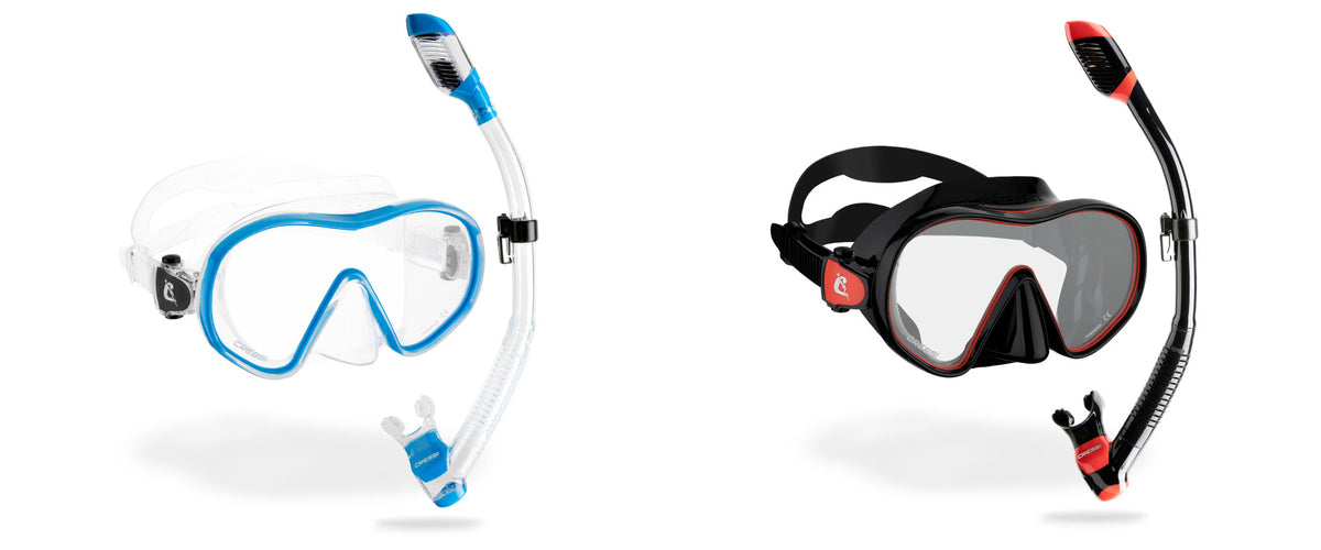 Frameless low-volume mask with wide vision and a dry snorkel for comfortable, splash-free breathing.