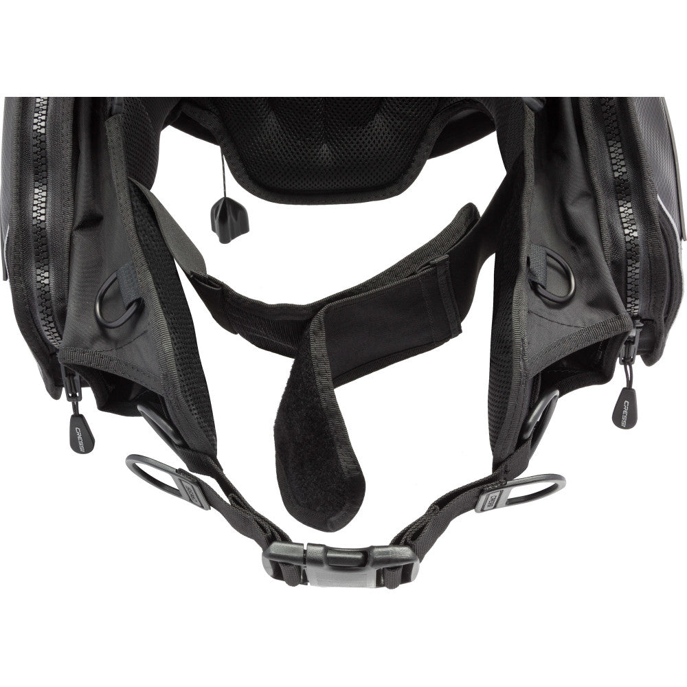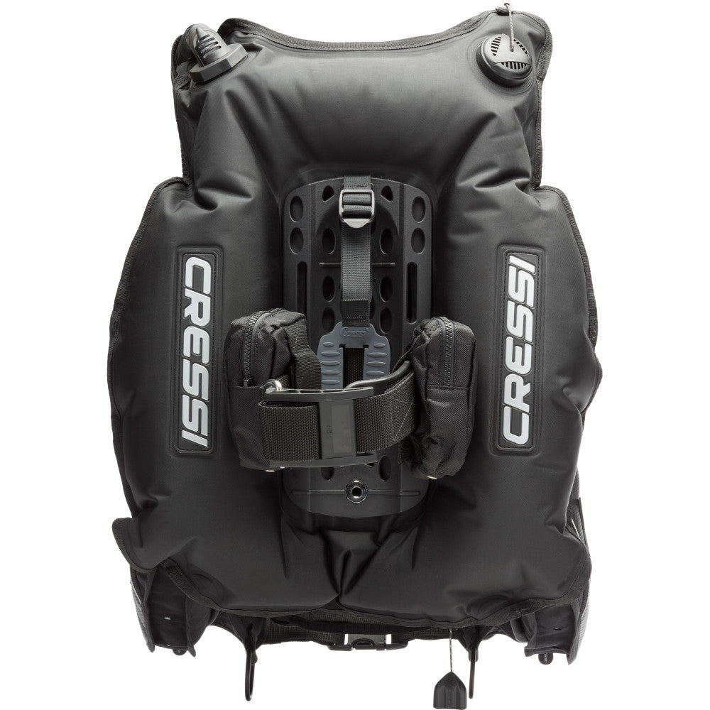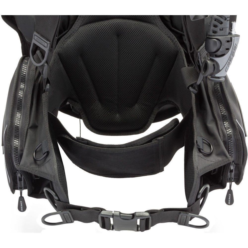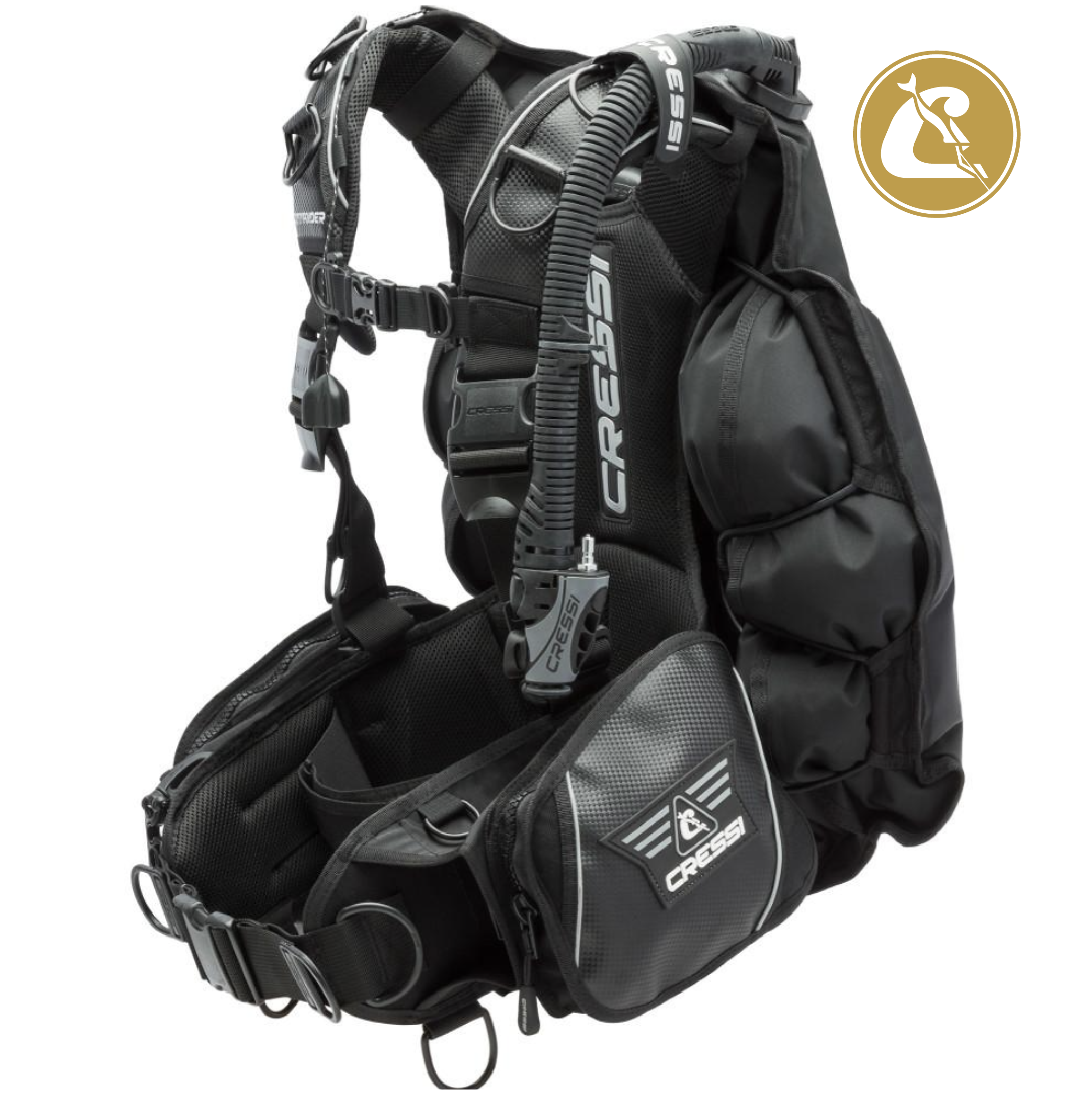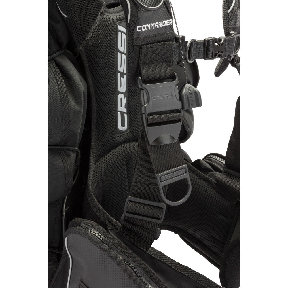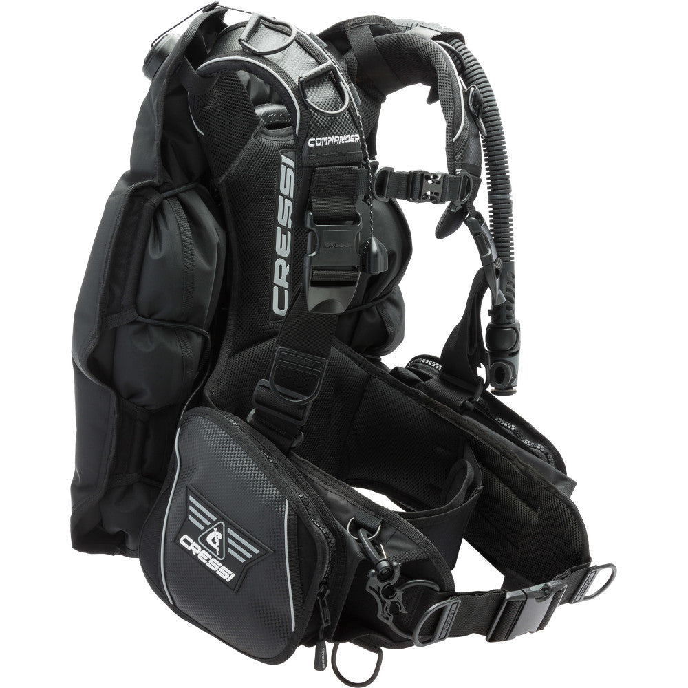 The Commander Evolution presents interesting news compared to its predecessor Commander. A very successful model that combines the advantages of the back air cell with the versatility of traditional jackets because, in addition to the built-in ballasting system, it has two zipper pockets of considerable capacity. It is an interesting proposal of 100% dorsal volume, with a robust construction but light at the same time (3,250 kg size M) and with a little volume of transport. The slinging system completely independent from the bag, now also in the shoulder area, guarantees the absolute stability of the vest on the diver and completely frees the chest, armpit and abdominal area from the oppression due to the expansion of the bag towards the dorsal area and around the bottle. Shoulder straps with an anti-scratch profile for use with light suits. Abdominal area with low-profile lobes and large zipped pockets. The dorsal air chamber offers the maximum lifting capacity of the entire Cressi range (19 kg size M) but with an external storage volume that is always contained, thanks to the elastic containment tensioners that have the additional mission of facilitating emptying maneuvers. The new LAS (Lock Aid System) 2.0 ballasting system is now more integrated into the profile of the sling and its thickness is thinner. This system, in the Cressi tradition, guarantees maximum ease of insertion and removal of the ballast in complete safety against accidental loss, as its anchors incorporate a spring effect (patented) in anticipation of accidental hooking. Its management is extremely ergonomic and intuitive even without looking. Two weight-holder compartments anchored in the cylinder band, very useful for defining the finish of the diver. It combines five different fabrics to achieve suitability depending on the needs of each area of the vest. The Commander Evolution is very light and semi-flexible to perform its function without adding weight or volume to the set. Fully lined with a comfortable neutral floating padding made of closed-cell material that prevents the accumulation of water or air and, therefore, reduces the inherent buoyancy of the sling and facilitates quick drying. New fixation flap of the hose assembly made of thermorubber with logo in relief. New low-profile top drain valve with a non-return valve that prevents accidental entry of water. 8 light-alloy rings with an angular design. Hose connector "Y".