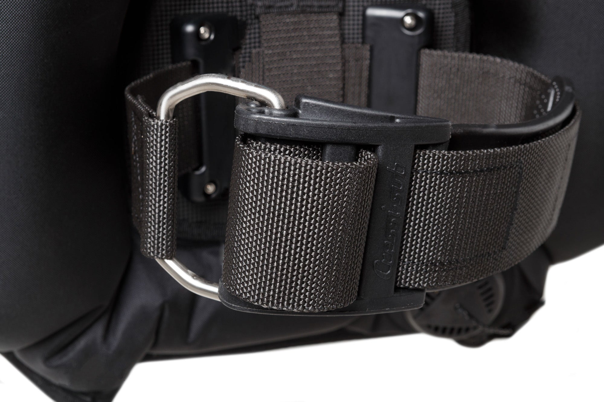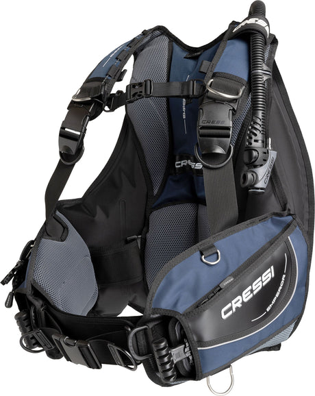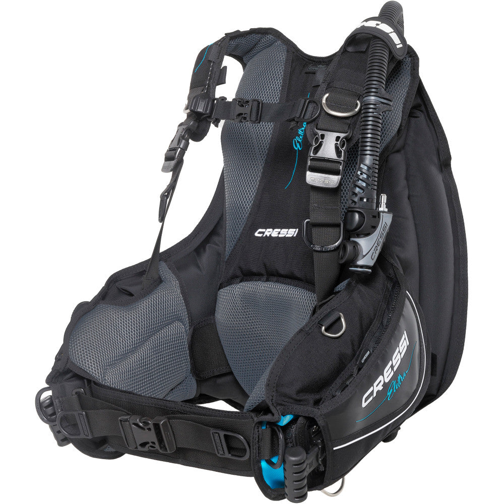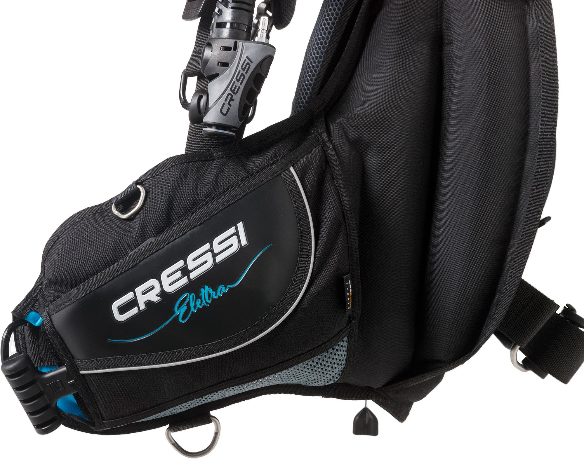 The Elettra jacket has been conceived to adapt to the female anatomy. The exclusive design and technical features provide perfect buoyancy with a close-fitting profile. The 40 mm buckles (shoulder- waist) adapt perfectly to the female anatomy. The lower band of the shoulder strap is anchored to a ring to ensure rotation and therefore maximum adaptability to the female anatomy. The internal part is fully lined with air-net material, with thicker padding to increase comfort and improve water drainage. The two-piece waistband uses the new patented SPWB (Self-Pivoting Waist Band) system. The soft and padded semi-rigid backplate permits the BCD to be folded and transported with the minimum possible volume. The Cressi Flat Lock integrated ballast system makes the extraction of the weight bags particularly easy. The jacket’s two integrated cylinder supports improve the diver’s buoyancy.