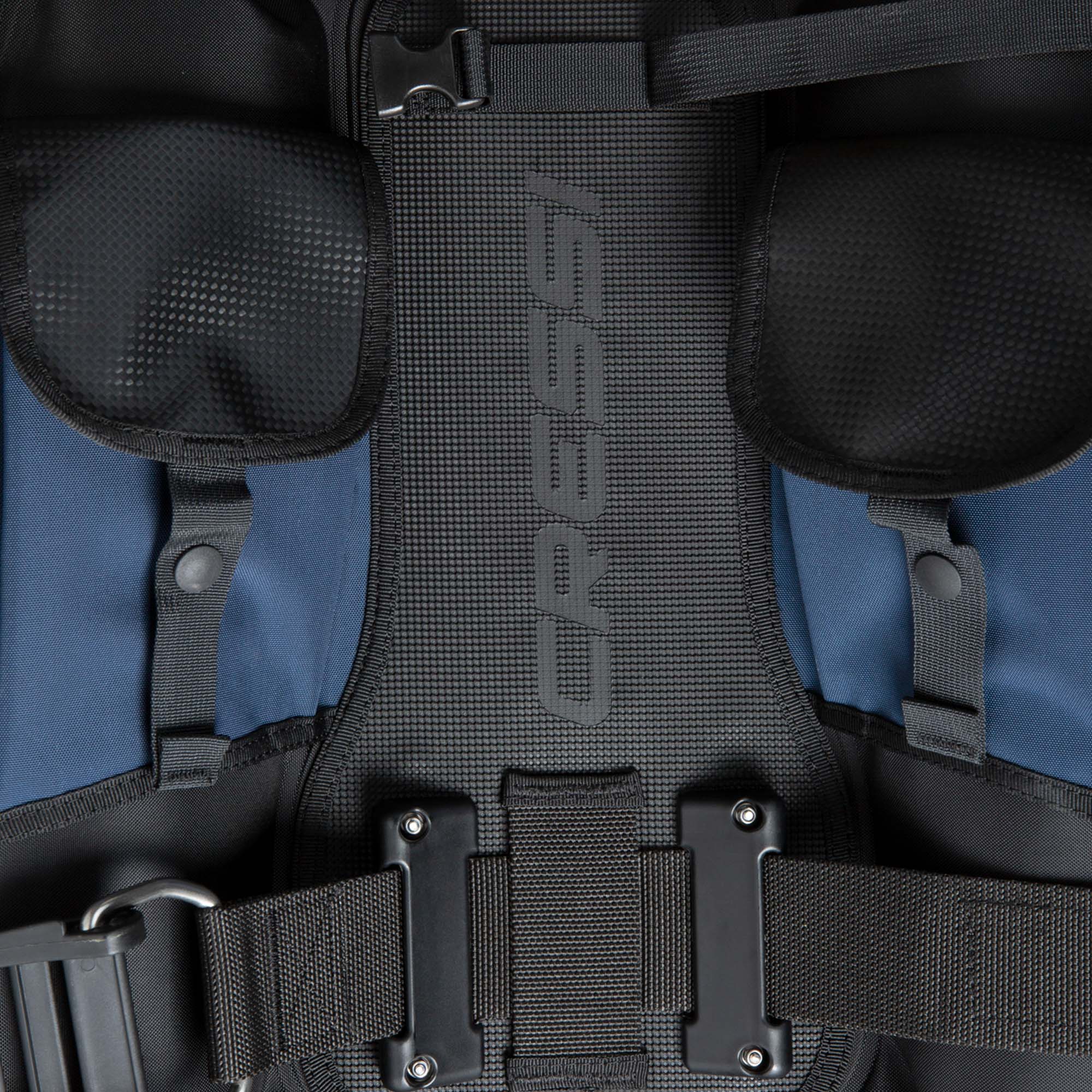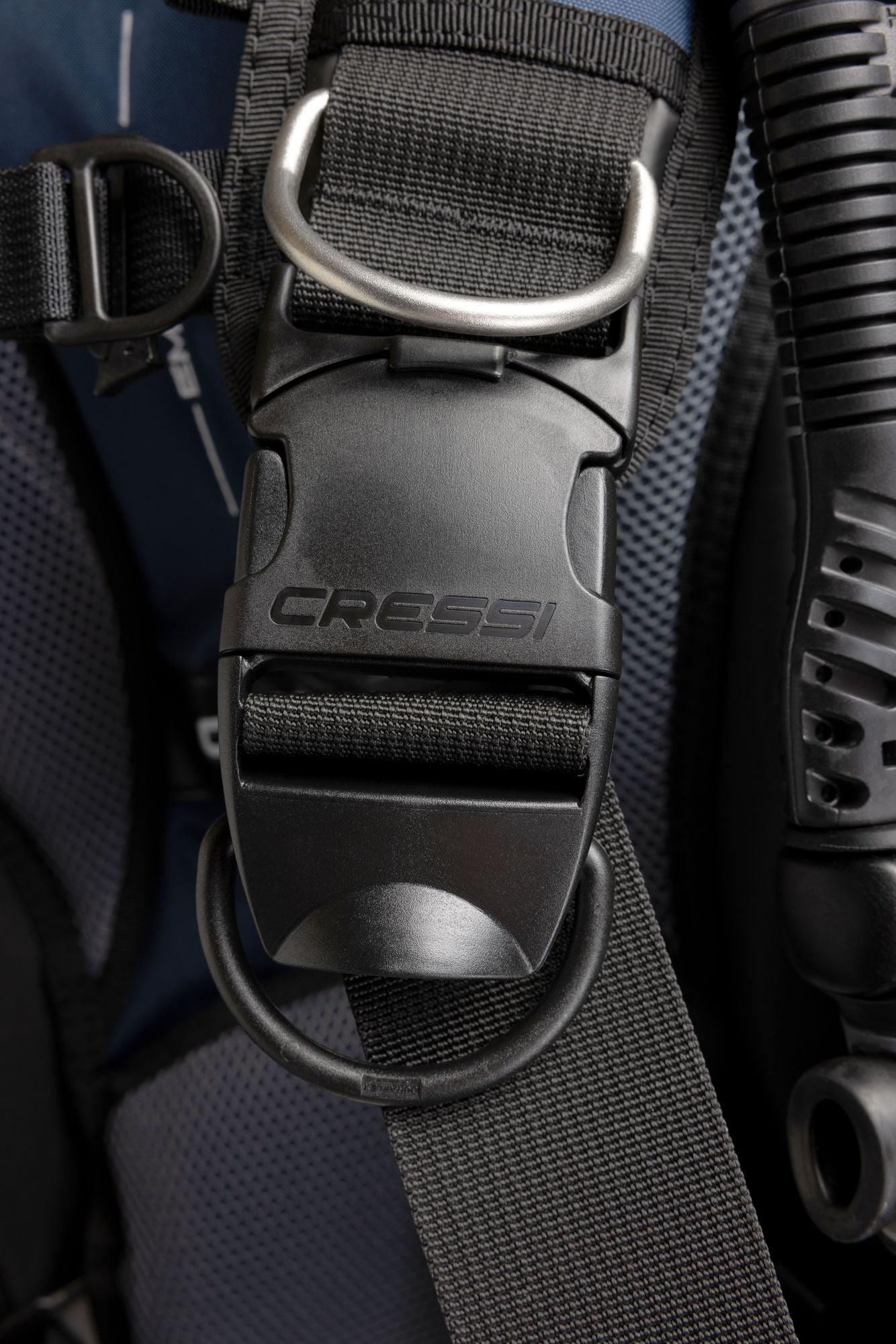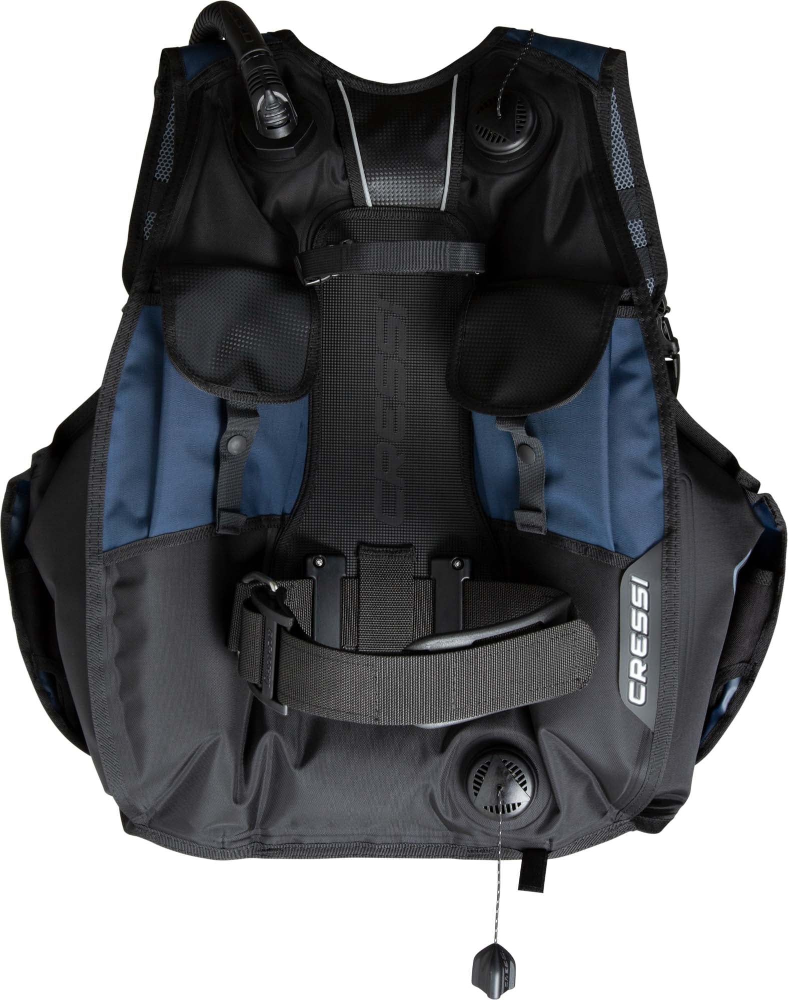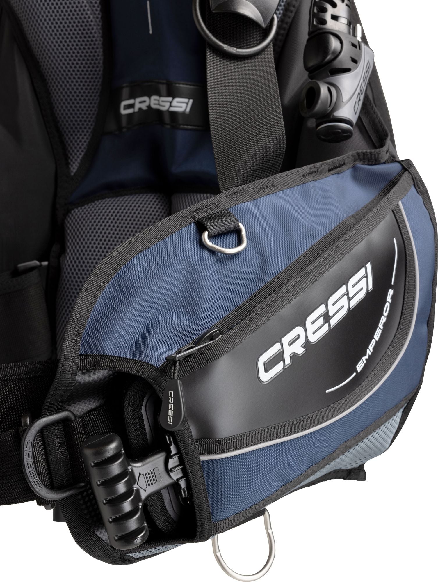 The Emperor is a BCD with an exclusive design and technical solutions that ensure perfect buoyancy and a snug profile. The shape of the bladder has been designed following the human body to increase comfort and wearability. The waistband has a newly developed concept, called SPWB which stands for Self-Pivoting Waist Band. The cummerbund is connected to the harness with a pivoting system allowing the waistband to follow the body shape increasing comfort and allowing freedom of movement. Thanks to the wide 50 mm pivoting buckles, the length of the shoulder straps is easy to adjust and rotates offering maximum comfort during movement. The lower strap of the shoulder strap is connected to a ring that allows rotation and thus maximum adaptability. The inside of the jacket is entirely made of air-net material, with extra padding to increase comfort and promote water drainage. The backrest, which is semi-rigid, soft, and padded, allows it to be folded and carried compactly. The Integrated Flat Lock ballast system allows to insertion of weights up to 10 pounds and thanks to its quick-release system with a wide handle is much easier to remove it in case of necessity. Two extra pockets are available on the back for weight distribution and always achieve the optimum buoyancy position. On each side, there is a large pocket with a zip closure allowing you to bring different tools. A clip for securing the octopus hose is included. The BCD is full of lightweight D-rings allowing to attach multiple devices. As common on all Cressi's BCD line, the inflator is easy to reach and use to adjust the inflation of the device. Furthermore, the device has two dump valves easy to reach thanks to the long cord, one is on the top right shoulder and the second on the bottom right.