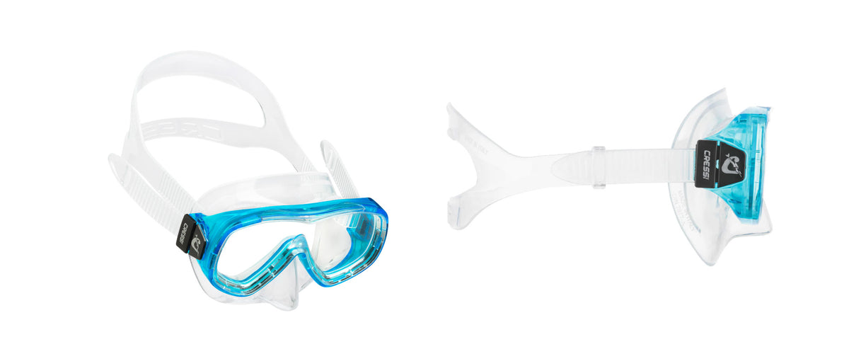 Piumetta is the mask especially made for young people that love to discover the underwater world. It is particularly suitable for snorkeling and swimming. It has separated polycarbonate lenses, a soft face skirt, with internal seal ring that fits to most facial contours, providing a high level of comfort. The internal volume is very small, good for going deep underwater. It is made from soft transparent silicone, and comes with strong rapid action buckles to adjust the strap.