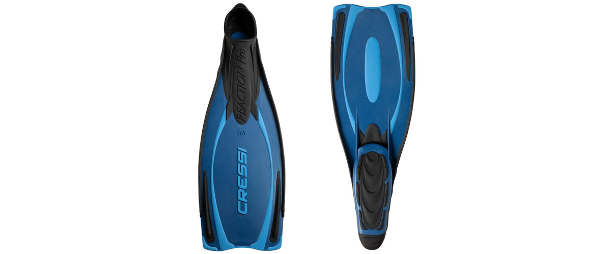 Reaction Pro is a full foot non-vented fin which has been developed after the Rondine. The Reaction Pro is an innovative fin in look and performance. It is molded using the exclusive and patented Cressi system with 3 materials. The three materials consist of a comfortable thermo-rubber (elastomer) anatomic, computer-designed foot pocket. The foot pocket encompasses the foot assuring transmission of the leg-to-fin thrust without loss of energy, adding efficiency to the fining action. The second material is the revolutionary new dual density (techno polymer) polypropylene which forms the blade, and in conjunction with the third silicone based material creates a channeling effect. The channeling effect is the characteristic of the fin that enables a high level of energy to be transferred in both up and down strokes of the kick pattern. The blade originates from the upper part of the foot pocket, with a 20% increase in useful surface area compared to a traditional fin of the same length. The blade also has a differentiated thickness and gets thinner towards the edge to guarantee greater and more uniform bending. The side stringers are made from two different materials that alternate with each other and overlap in different zones to obtain a structure with controlled flexibility in the different areas of the blade. To all these excellent features, Reaction Pro adds a new, longer, more flexible and lighter blade that provides excellent thrust with minimum muscle fatigue and the smallest expenditure of energy.