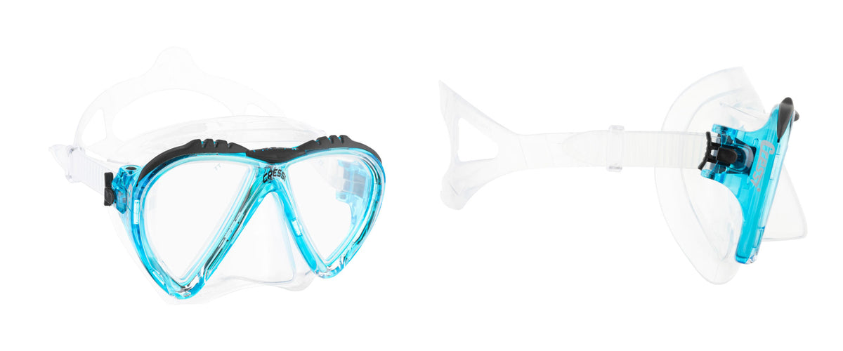 For all intents and purposes, the Lince can be considered the little brother of the Cressi Matrix, due to its volumes and dimensions. The Lince is a descendant of the legendary Big Eyes, from which it takes all its exceptional characteristics in terms of visibility, with a skirt designed for narrow faces, ideal for women and children. It has a very low internal volume, even lower than that of the specific free diving models. It can be used with great satisfaction even by enthusiasts of the most demanding free dive descents. Its extraordinary visibility, together with extreme comfort and a modern and efficient system for adjusting the strap, makes this model indispensable for all diving activities, from snorkeling to deep free diving, to scuba diving.