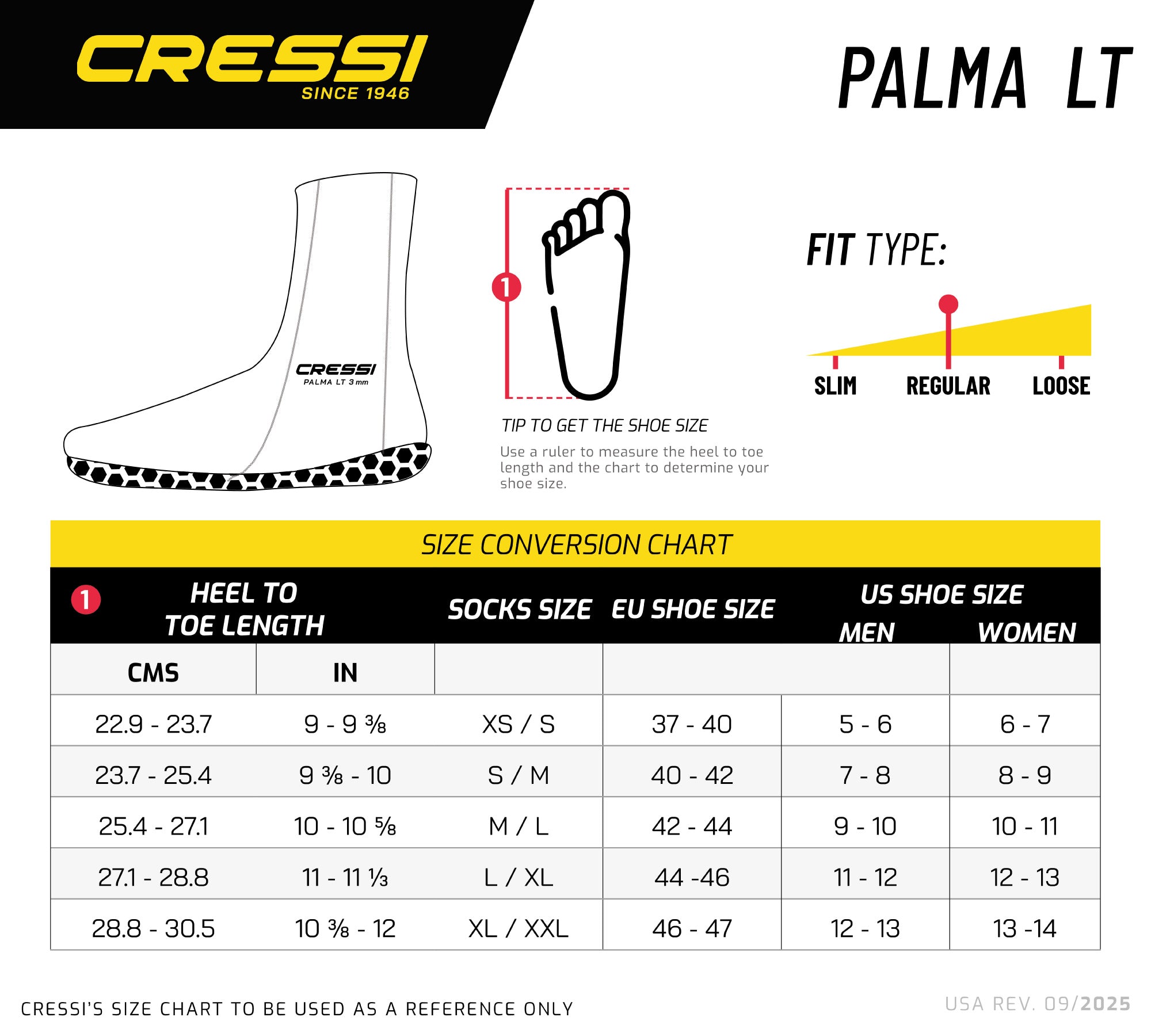 The Palma LT 3mm are manufactured from a superelastic and ultra-durable 3mm thick Neoprene and Nylon for ensuring warmth and comfort. These tall socks are great for either full foot or open heel fins. The socks are lightweight and a great addition to the traveling diver's gear bag. Socks are extremely comfortable equipped with a Rubber Grip Sole design to assist with Non-Slip on wet surfaces such as boat decks and slipper ladders. The Palma are built-to-last with glued-and-sewn seams for strength and durability.