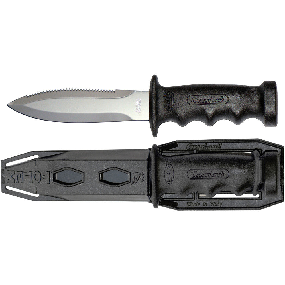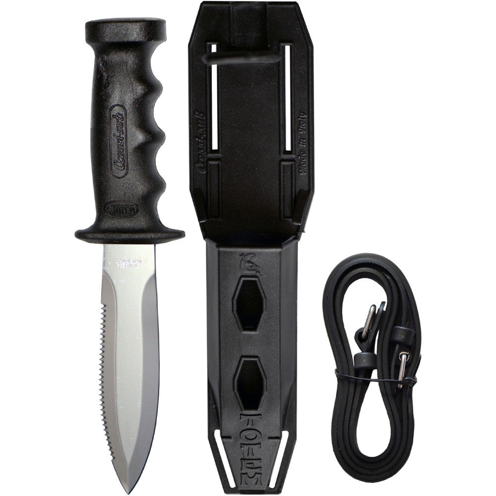 An inexpensive, average-size knife with an excellent quality-price ratio. One side of the stainless steel blade is straight-edged, the other one is serrated right along the blade; they are both very sharp and effective for line cutting. The anatomic grip is made from technopolymers and has a series of molds for the fingers, ending with a thumb protection tab at the blade end. The plastic sheath holds the knife firmly with a pair of elastic bands and has loops to attach it to the leg or to be attached to the waist.