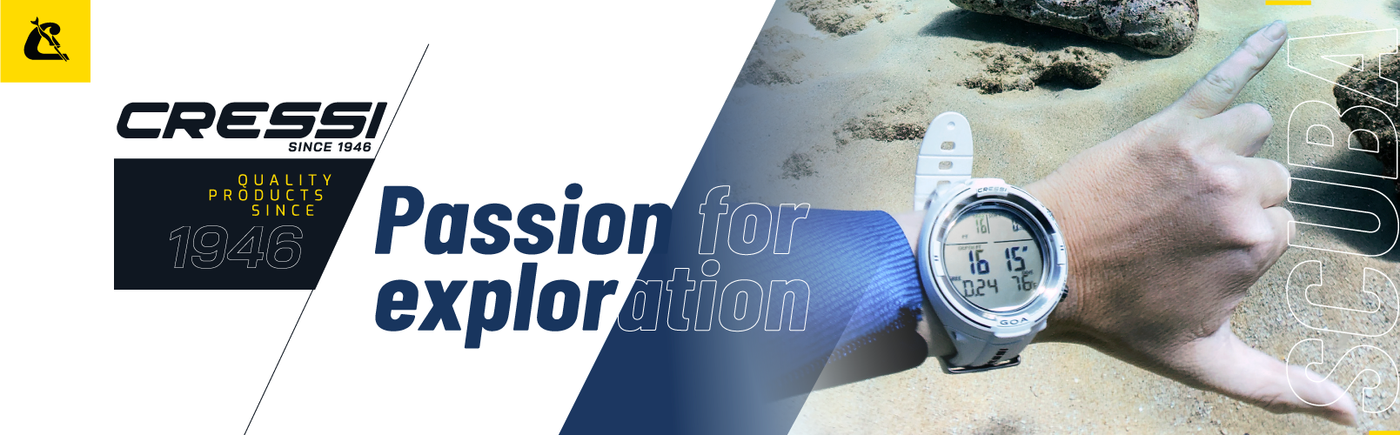 Cressi Elettronica has developed our newest computer, the Goa, from scratch. It features a new CPU that is faster with greater functionality. Our latest motherboard is completely redesigned, allowing for a larger battery for long-lasting life. The case has a diameter of only 1 7/8 in (48 mm) and a high contrast display of 1 3/8 in (35 mm). The computer monitor is made of mineral glass and the case is heavy-duty with steel buttons that have an underwater resistance up to 393 ft (120 m). Plastic/Steel bezel and stainless steel back cover. It has only 2 buttons making the menu easy to navigate. It not only features programs for scuba diving but also has a program for free diving, in which it is possible to customize different alarms. It is also an ideal watch for other underwater activities due to the deactivation option of the dive functions that avoid unnecessary alarms while snorkeling or swimming. Data is acquired 4 times faster: every 5 seconds while scuba diving and every 2 seconds while free diving. Additionally, the computer acquires temperature data. The result is a more complete and precise chart that is viewable in the interface software. Through the Cressi Interface application (sold apart), a user can download and analyze the diving data recorded on the Goa. The dive computer can be linked to a smartphone using the BT Interface (sold separately). It communicates with the dive computer via an IR connection. Use the Cressi app (available for Android and iOS) to download diving sessions and monitor training. It is possible to save a logbook with a memory of 50 dives per category. The records are completed with two graphs, showing the water pressure data (taken every 5 seconds) and water temperature data (taken every 5 seconds). All the information can be uploaded to the DAN (Divers Alert Network). The device is powered by a long-lasting CR2450 button battery which can be replaced by an authorized Cressi center by verifying perfect watertightness.