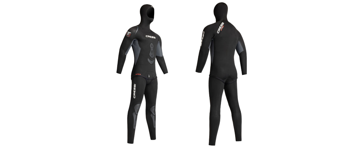 The Apnea wetsuit is manufactured with flexible, comfortable, soft open cell neoprene. This material is designed for flexibility. It is flexible enough for free motion to the wearer's movements involved in spearfishing and swimming. Featuring an excellent wetsuit cut, its anatomical design cuts offer a comfortable form fitted feel. The suit design is pre-shaped arms and legs that improve flexibility and the ease of swimming. It is reinforced in all high stress areas such as elbows and knees. The Apnea is a two-piece suit, which includes high top pants and a jacket with built-in hood. Smooth skin watertight seals on the hood, wrists and waist ensure warmth. As an added durability feature, the knee and shin area of the overalls and the elbows of the jacket are reinforced. Additionally, the jacket offers extensive chest support to lessen the load imposed by the spear gun. All seams are glued and sewn for strength and durability. The Apnea completes the spearfishing line of suits. Its versatile all black color allows it to be used in all spearfishing environments.