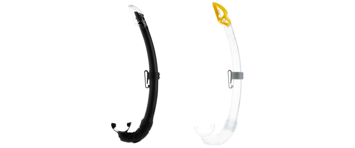 The Mexico snorkel is a high-end tube specifically studied to form a perfect fit on any face shape and features a completely rounded progressive profile.