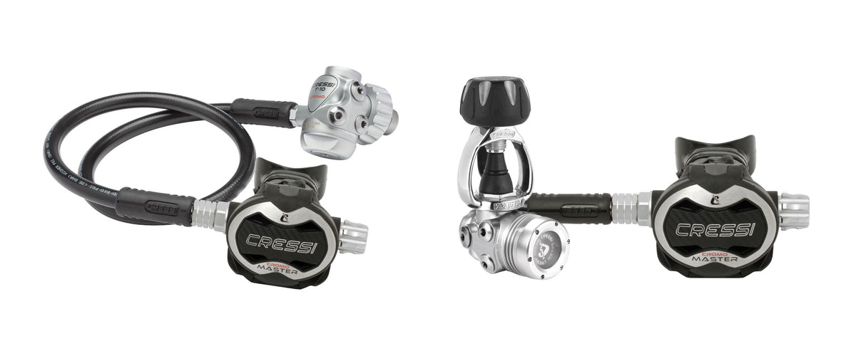 The T10-SC/Master Cromo is an all-around scuba diving regulator ideal to be used in any condition. It is compact, light, reliable and it will accompany you throughout your life on any trips. It is certified for cold water use by the CE standards. The T10-SC 1st stage is environmentally sealed, protecting it against icing in cold water and against contamination from particulate matter in silty conditions. 2 HP and 4 LP ports. Available in INT and DIN version. The T configuration enables better integration of the first stage in the profile of the valve, and thus greater freedom of movement of the diver’s head. The HP saddle is made from AISI 316 stainless steel. The mechanism works transversally, supplying air and filtering potential particulates coming from the tank that manages to pass through the filter so that they do not directly affect the valve. When paired with the Master Cromo 2nd stage, which includes an internal heat exchanger, this regulator is an excellent choice for divers exploring the most extreme cold water environments. It features a pleasing and durable satin chrome finish. Pneumatic compensation mechanism to guarantee smooth exceptional flow and abundant calibrated air delivery with no need for an accentuated Venturi effect. The knob includes a nut for fine-tuning the breathing effort.