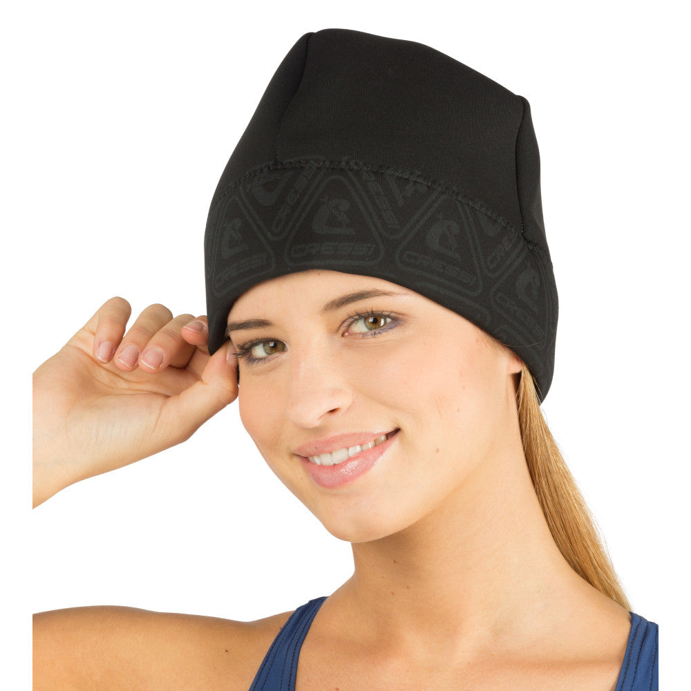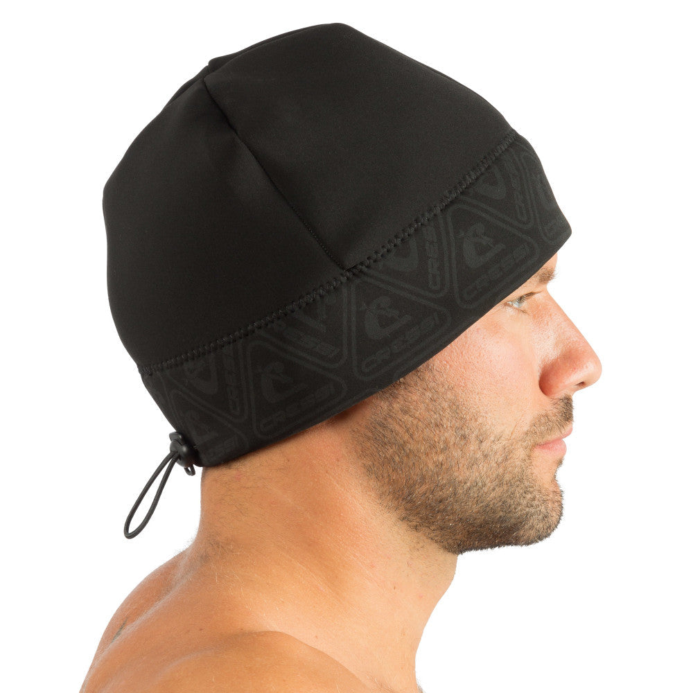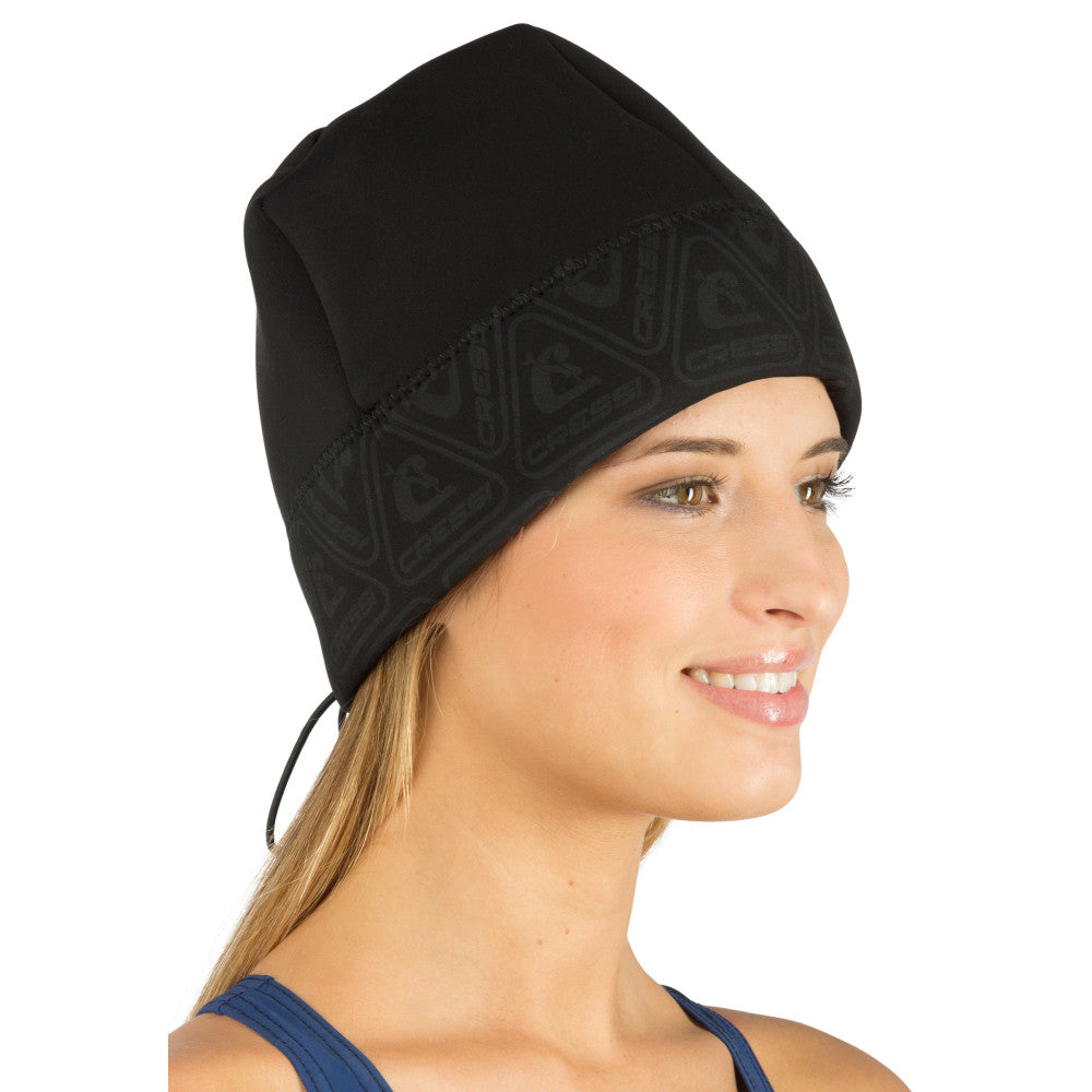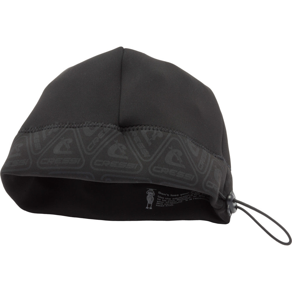 Don’t lose your Cressi Beanie! The Cressi beanie comes with an adjustable drawstring elastic cord to tie your Beanie to the zipper pull webbing of your Cressi wetsuit, or any other piece of your dive equipment. It is recommended to use larks head knot. Made of neoprene and nylon, this beanie will keep your head warm.