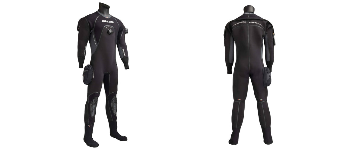 The Desert drysuit is a great suit for scuba diving, designed for beginners and diving lovers. In addition to its high finish quality in terms of seams, heat-sealing and patterned design, Desert stands out for the use of neoprene pre-compressed from 7 to 4 mm. This neoprene has the advantage of excellent thermal protection in the base due to its incompressibility in addition to a reduced weight belt requirement. Also reduces the need to use large undergarments as with trilaminate suits. The rigidity of this type of neoprene has been compensated with the use of exterior lining Ultraspan© with a brilliant finish, hydrodynamic gliding, and great elasticity in all directions. In this way, we combine the comfort of a wetsuit with a premium look and outstanding technical performance. Areas with a tendency for the greatest wear are reinforced with Small Dyamond© exterior fabric: shoulders, the upper part of the chest, armpits, inseam, knees, and ankles. Liquid seal sealed seams for greater resistance to wear and fraying. The areas that may require repairs or replacements: sleeves, collar, and booties have traditional seams to facilitate replacement if necessary. Collar and wrist seals made of 5mm (wrist) and 3 mm (collar) ultra-elastic neoprene, with Ultraspan lining, easily replaceable in case of wearing. Sitech© valves. The inflation valve located on the chest utilizes a lateral button to avoid accidental activation, and the bleed valve is located on the upper left arm. Marine brass BDM© 8 pitch zipper guarantees reliability without overly sacrificing suit elasticity in the dorsal area. The suit entry is oversized to facilitate donning and the zipper is protected by an external flap to prevent tearing and abrasion. Neoprene hip storage pocket. YKK zipper. The knee and tibia areas have elastic anti-wear Tatex® reinforcements. This type of strengthening provides sufficient strength and allows suit donning without limiting the elasticity of the neoprene. Booties without soles with reinforcements limited to the support areas so as not to reduce the adaptability to different foot sizes. Highly abrasion-resistant Black Diamond© fabric sole. In this way the stocks and orders are managed, the thermal conductivity of the suit is improved, normal fin sizing is maintained and the key hard boot-calf union is avoided, one of the most common areas for breaks and water leaks in dry suits. Hood and paraffin zipstick included.