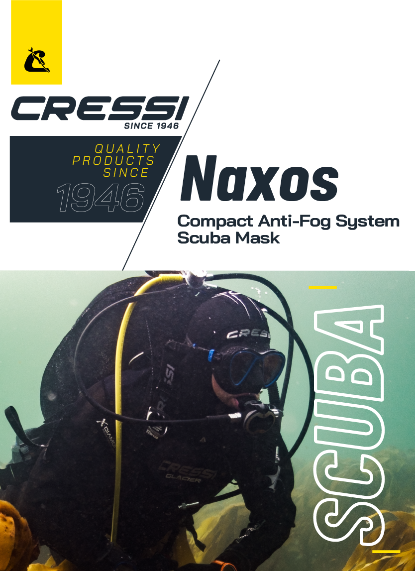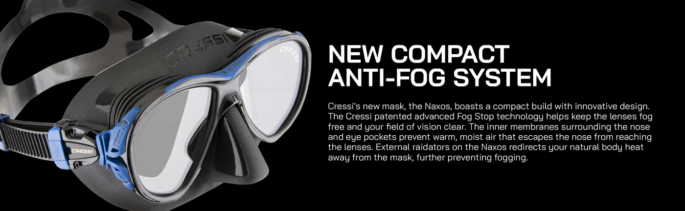 Following Cressi's patented Stop-Fog system the Naxos is the last entry-level with this innovative feature. It is compact and smaller in size than a classic diving mask, but this unique feature does not reduce the field of vision, and thanks to new internal ribs, it adapts perfectly to any anatomy of the face. Naxos, like Quantum, not only offers increased downward vision but also avoids the phenomenon of fogging by thermoregulating the warm, moist air escaping from the nose inside the mask. This is channeled by a system of membranes in the mold around the eyes and nose, which deflect the flow toward the rubber walls and not toward the glass. On the outside of the walls is a cooling system consisting of two small heat exchangers that function like radiators. The effect is that the temperature inside the mask is lowered, bringing it closer to the outside temperature, and moisture droplets are trapped before the air reaches the glasses, thus preventing them from fogging up. The lenses are not chemically treated, so it should be remembered that when the mask is new, as is recommended for all masks, it is best to clean the lenses thoroughly with toothpaste, dishwashing detergent or simply use a lighter to burn off all volatiles and impurities deposited on the glass.